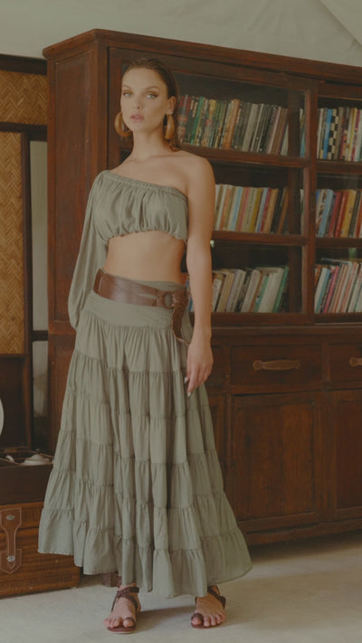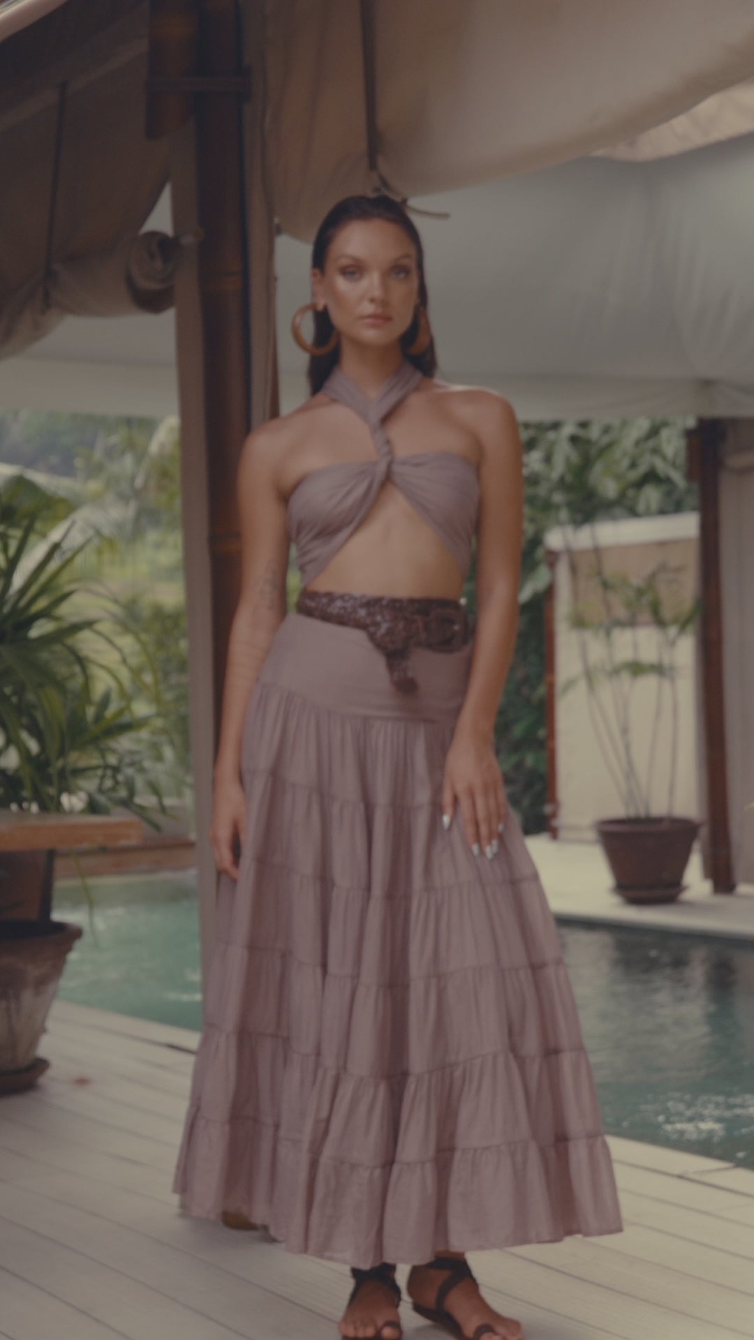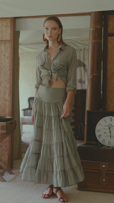 Floor gazing with cascading tiers, this maxi skirt pays tribute to our classic boho aesthetic while initiating a bold statement with every step.