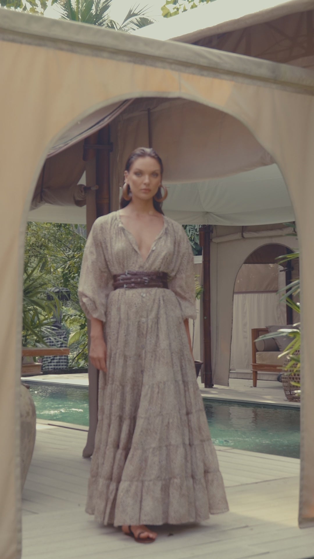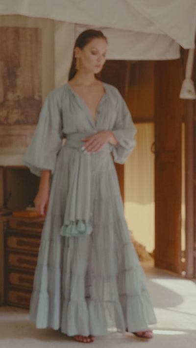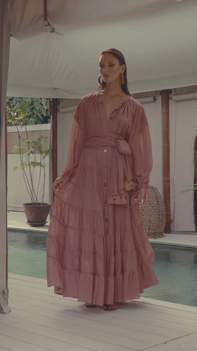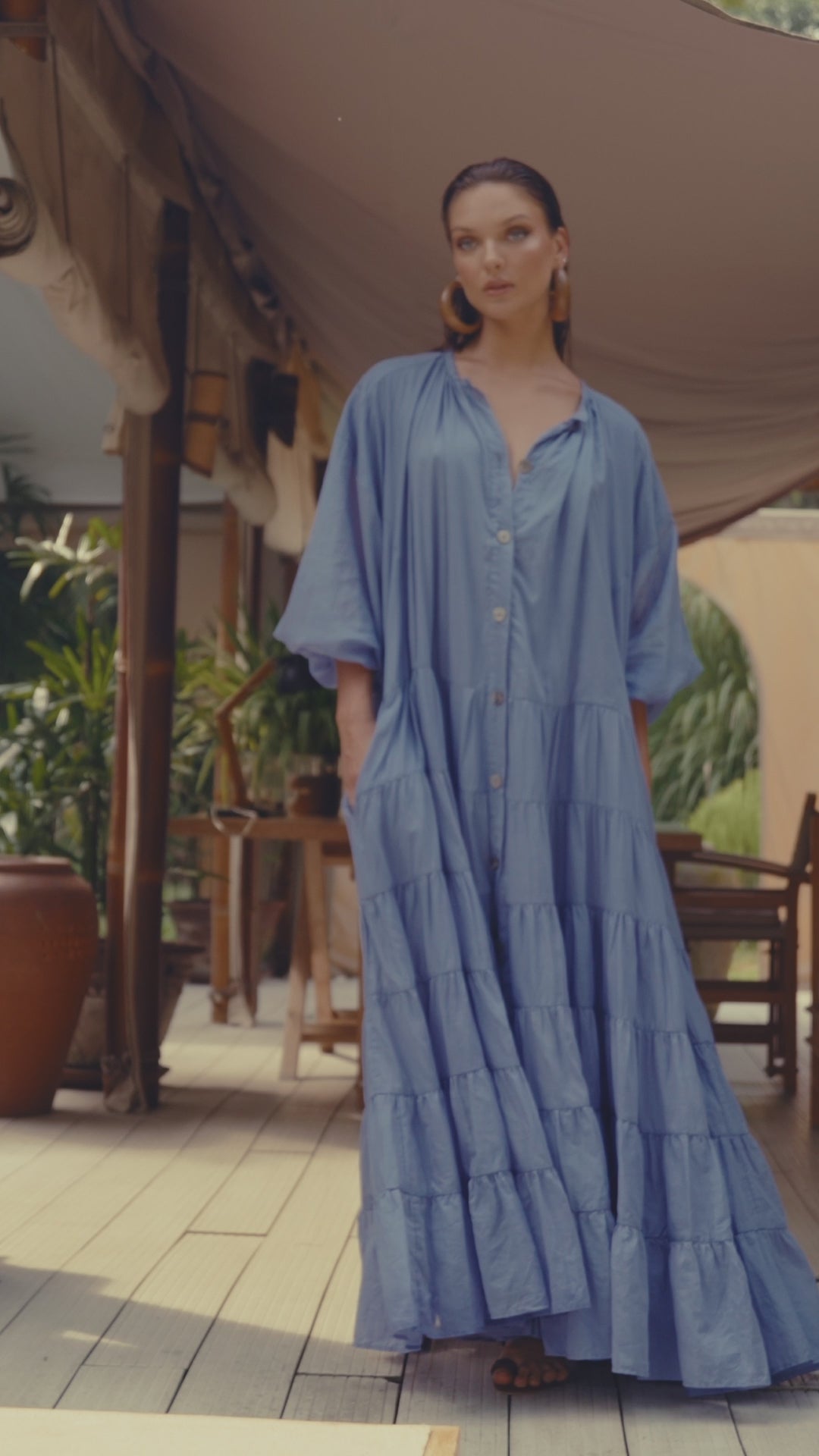 Convertible shirt dress with full billowy sleeves and full mother-of-pearl button-down front. This dress consumes 16 meters of hand-dyed 100% cotton voile fabric and takes 15 hours of sewing time to create the voluminous effect of the multiple cascading tiers.