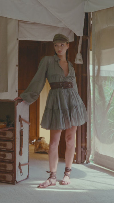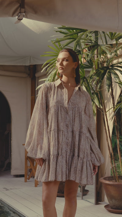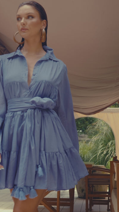 Long sleeve short dress with collared neckline and full billowy sleeves. This dress consumes 9 meters of hand-dyed cotton voile fabric and takes 12 hours of sewing time to create the voluminous effect of the multiple cascading tiers. Finished with French seams.