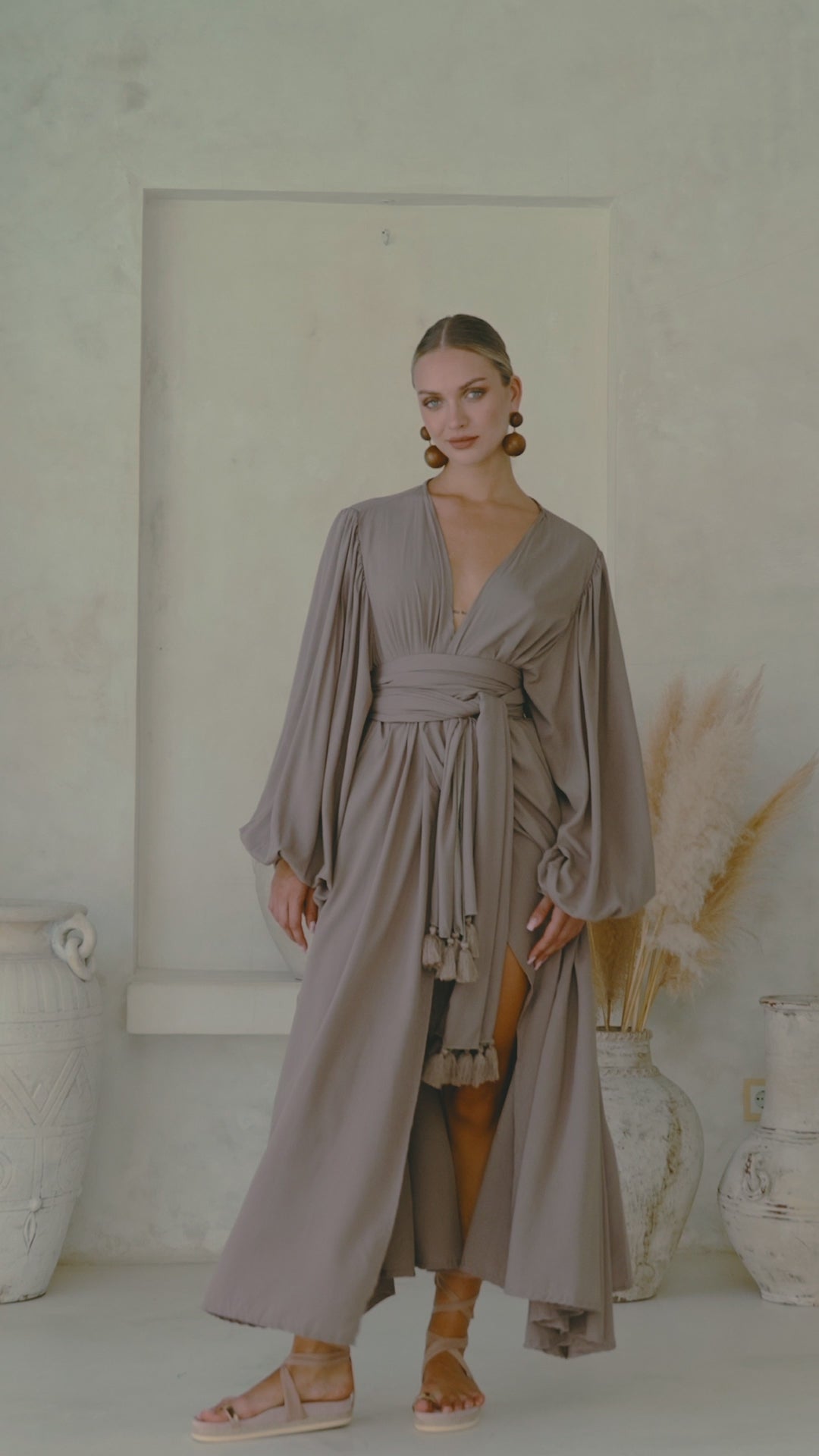 Jacket with full billowy sleeve and open front. This dress consumes 13 meters of hand-dyed 100% rayon fabric and takes 12 hours sewing time to create the voluminous effect of the multiple cascading tiers. Finished with French seams.
