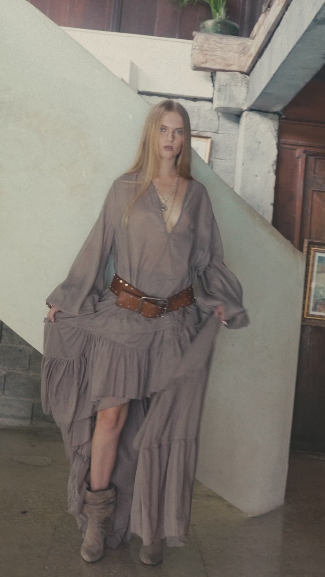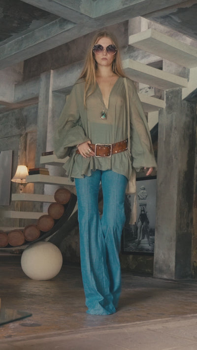A perfect balance of bohemian ease and modern sophistication, this V-neck blouse features billowing sheer sleeves and a fluid, relaxed fit. Pair it with flowing skirts or tailored pants for a chic resort-ready look that transitions seamlessly from day to night. Creates a sophisticated yet effortless silhouette—ideal for sunset gatherings, artful layering, or a refined resort-ready look.