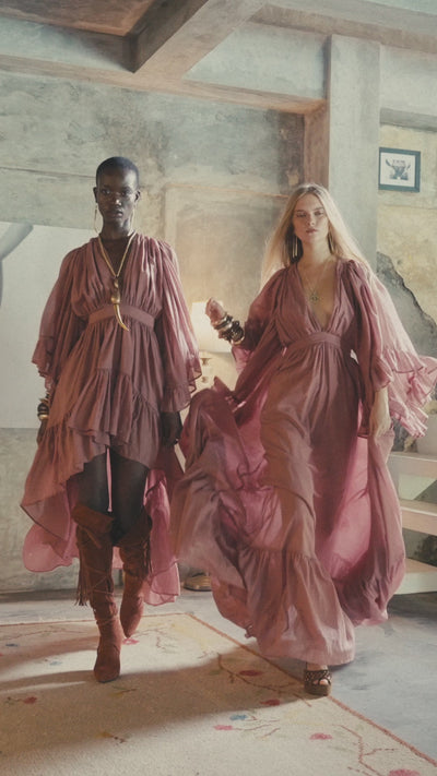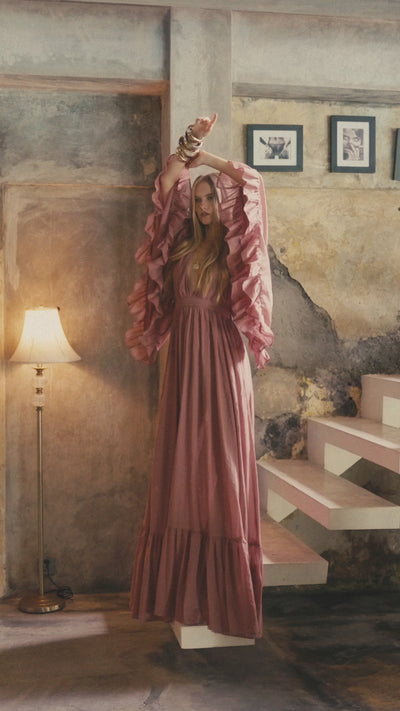 A vision of effortless elegance, Designed for the free-spirited soul. this full-length dress features a cinched waist, dramatic flutter sleeves, and a deep V-neckline, this dress is the epitome of bohemian luxury.