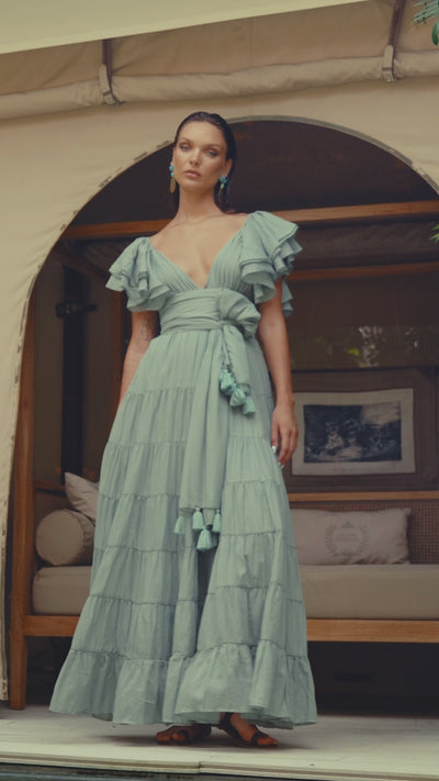 Dress consumes 17 meters of hand-dyed 100% cotton voile fabric and takes 16 hours sewing time to create the bias-cut effect of the multiple voluminous floor length tiers.