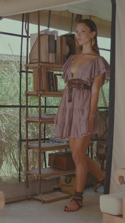 V-Neck short dress with ruffle sleeves. This dress consumes 11 meters of hand-dyed 100% cotton voile fabric and takes 15 hours of sewing time to create the voluminous effect of the multiple cascading tiers.