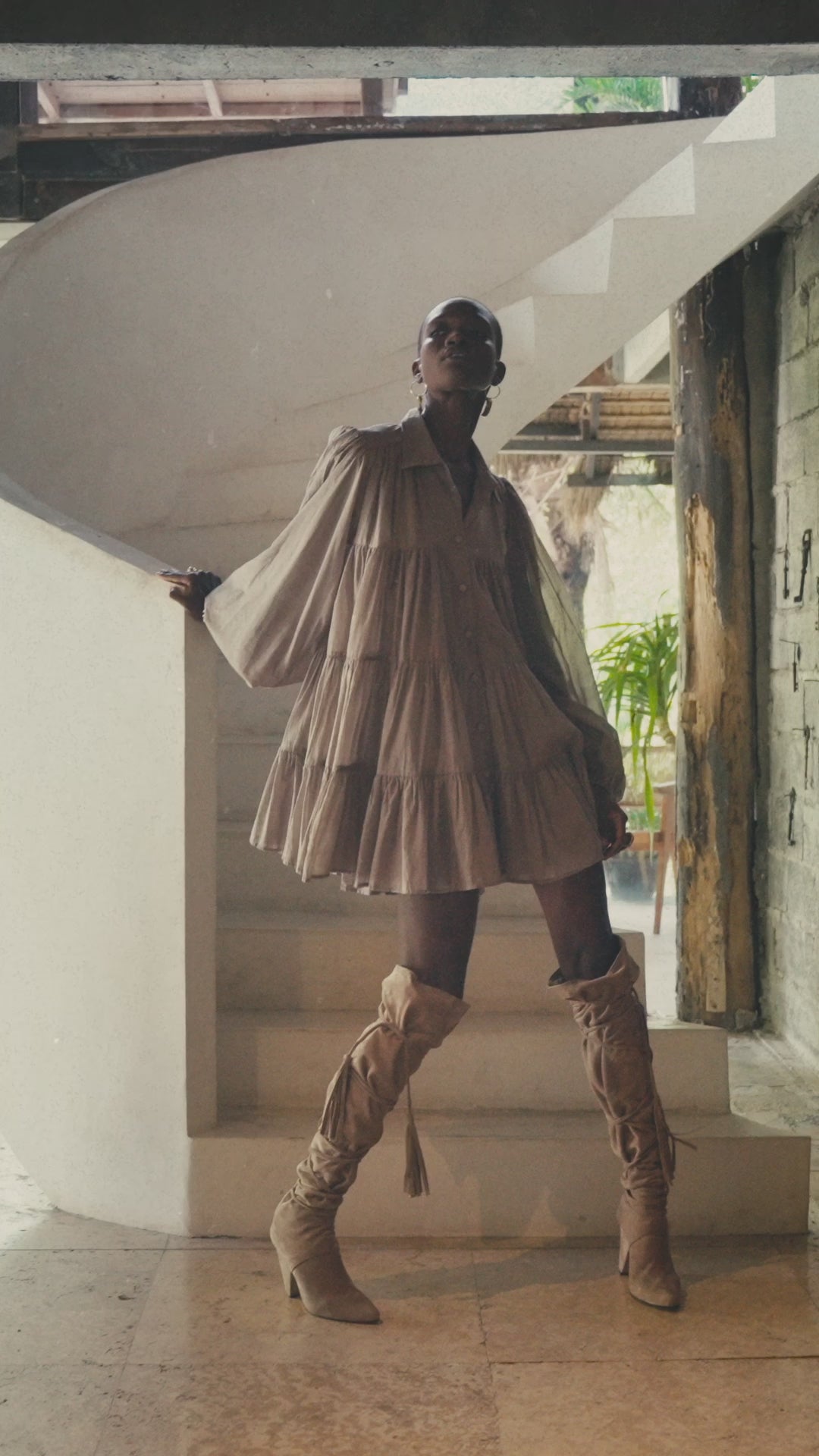 Long sleeve short dress with collared neckline and full billowy sleeves. This dress consumes 9 meters of hand-dyed cotton voile fabric and takes 12 hours of sewing time to create the voluminous effect of the multiple cascading tiers. Finished with French seams.