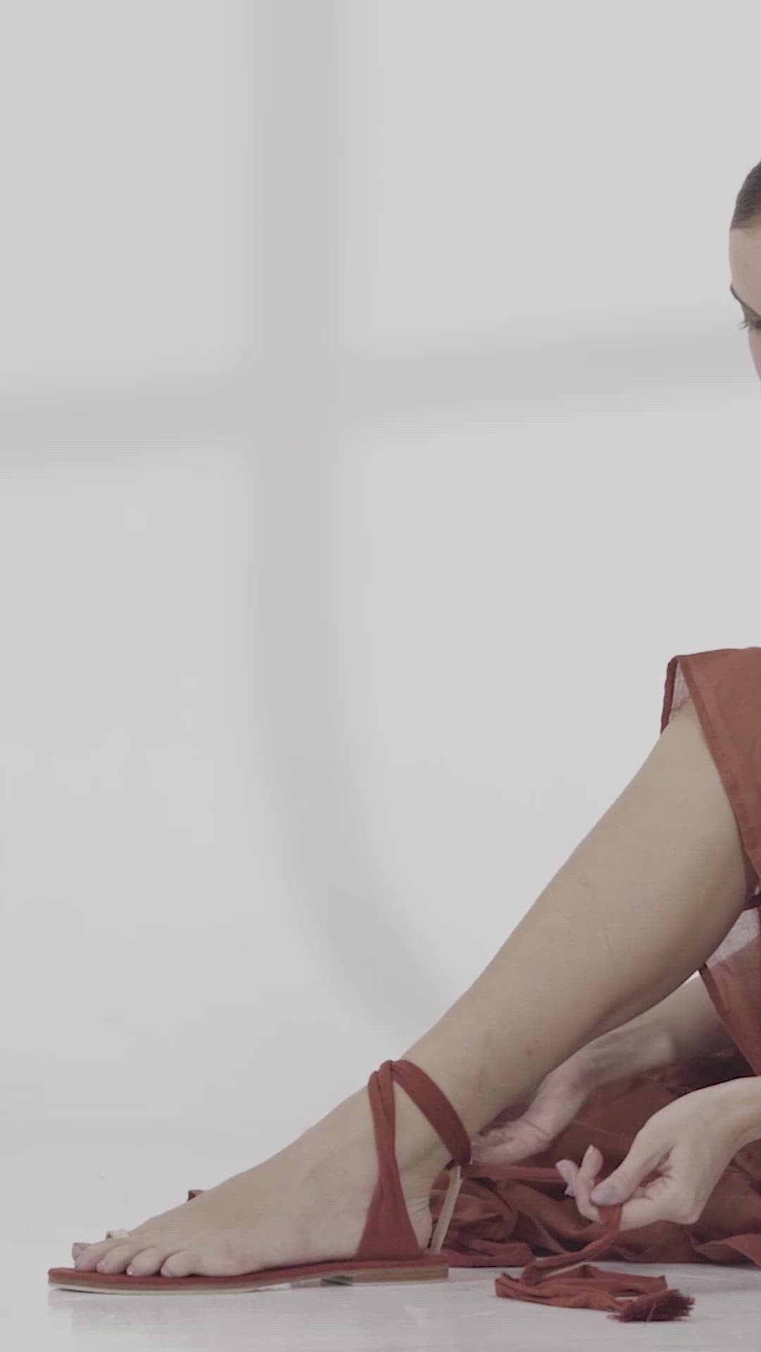 Thing long straps of cotton stretch fabric with a knotted detail. Adjustable with wrap around leg straps, gladiator style.