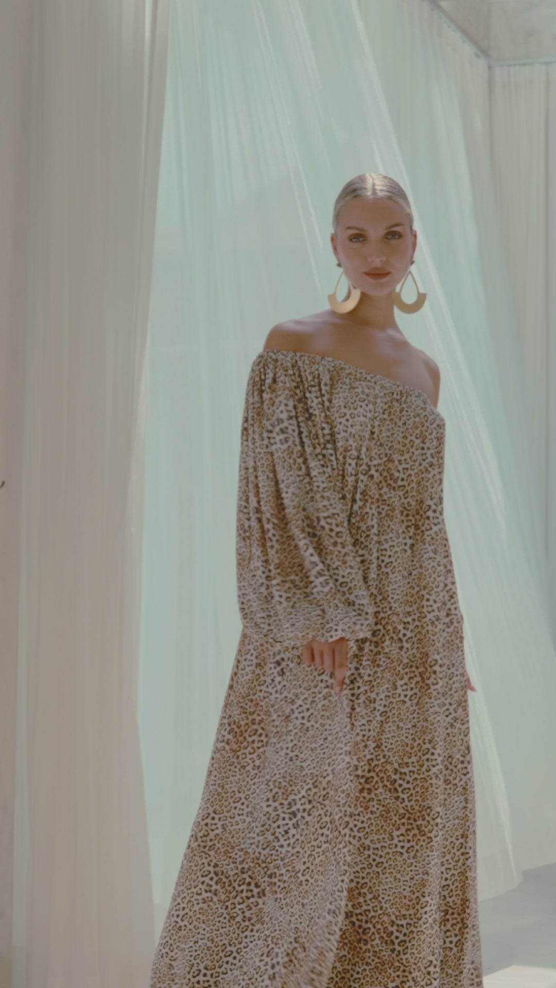 One shoulder maxi dress with elastic neckline and single full billowy sleeves. This dress consumes 9 meters of hand-dyed 100% rayon blend fabric and takes 7 hours of sewing time to create the voluminous effect of the multiple cascading tiers. Finished with French seams.